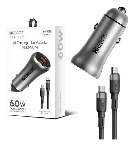 Carregador Veicular Power Turbo 60w Premium Cabo Dual Tipo-C (CRV-202C)